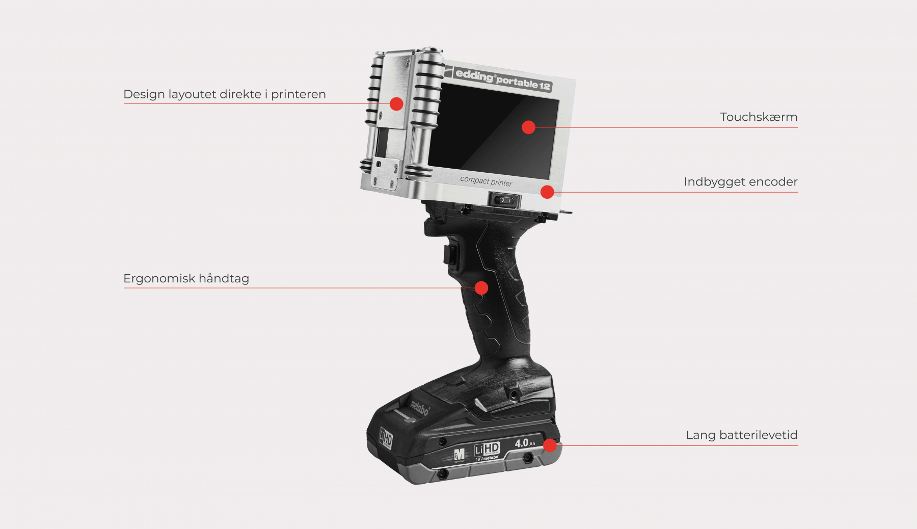 Udstyret er velegnet til brug i mindre og middelstore produktionsmiljøer, og driftsomkostningerne er minimale. Den er ideel hvis du skal mærke produkter udenfor din egentlige produktionslinje. Det genopladelige batteri kan holde til 12 timers non-stop brug.