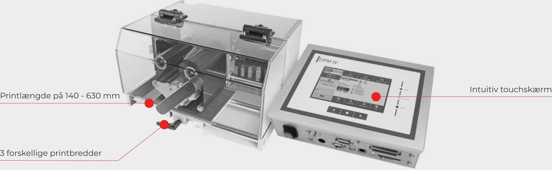 DPM skriver - med høj opløsning - på emballage, der er forskellig i facon og størrelse. Printeren har stor fleksibilitet og lave driftsomkostninger, og udmærker sig ved at kunne printe i kolonner på tværs af en filmbane. Den kan derfor - og med fordel bruges til at mærke pakker i en dybtrækker eller hvis du har brug for meget store print.