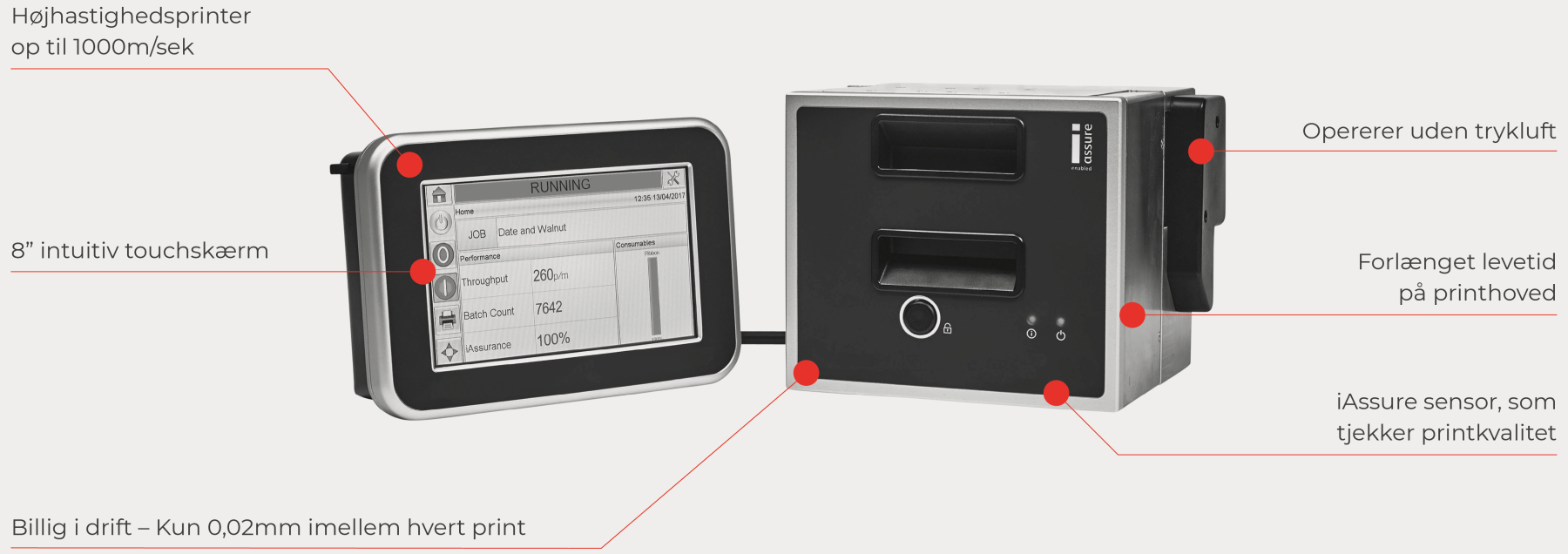 Printeren er enkel at integrere i din produktionslinje og den fås i både højre og venstre model. Printjobs overføres til printeren via netværkskabel eller med USB stick, og touchskærmen gør den nem at betjene.