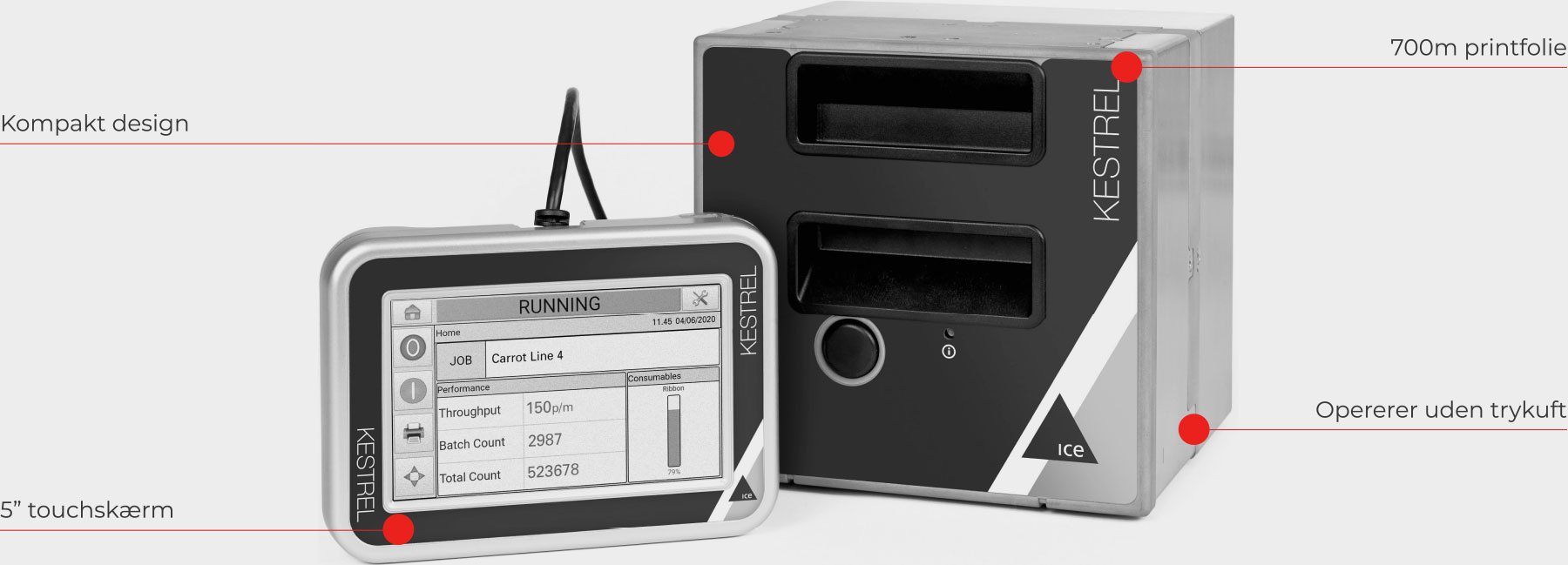 Kestrel fås i 2 modeller: Højre og venstre. Den er ideel til mærkning af produkter, der har forskellige størrelser og former, og den bruges ofte i mindre produktioner i fødevarebranchen.