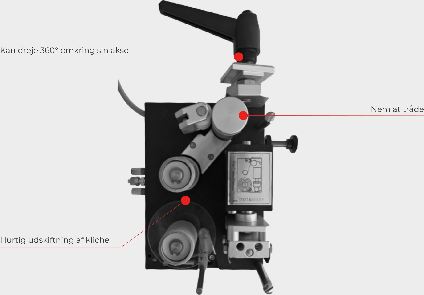Du kan montere den både horisontalt, vertikalt, og med et enkelt greb kan den drejes 360° omkring sin egen akse. Din mærkning kan være op til 40mm i bredden og 20mm i højden, trykkraften er 500N, og du kan mærke op til 150 produkter i minuttet.