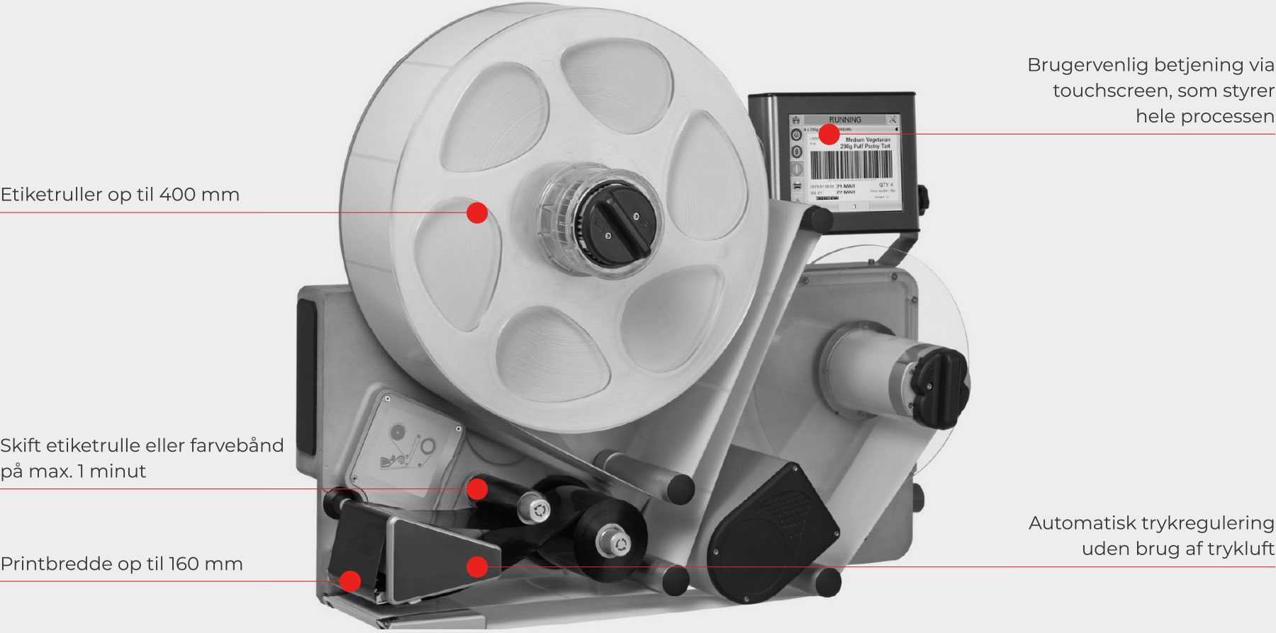 Du får hurtig applikator, der placerer etiketten meget præcist, og har en revolutionerende printhovedteknologi som drives uden trykluft.