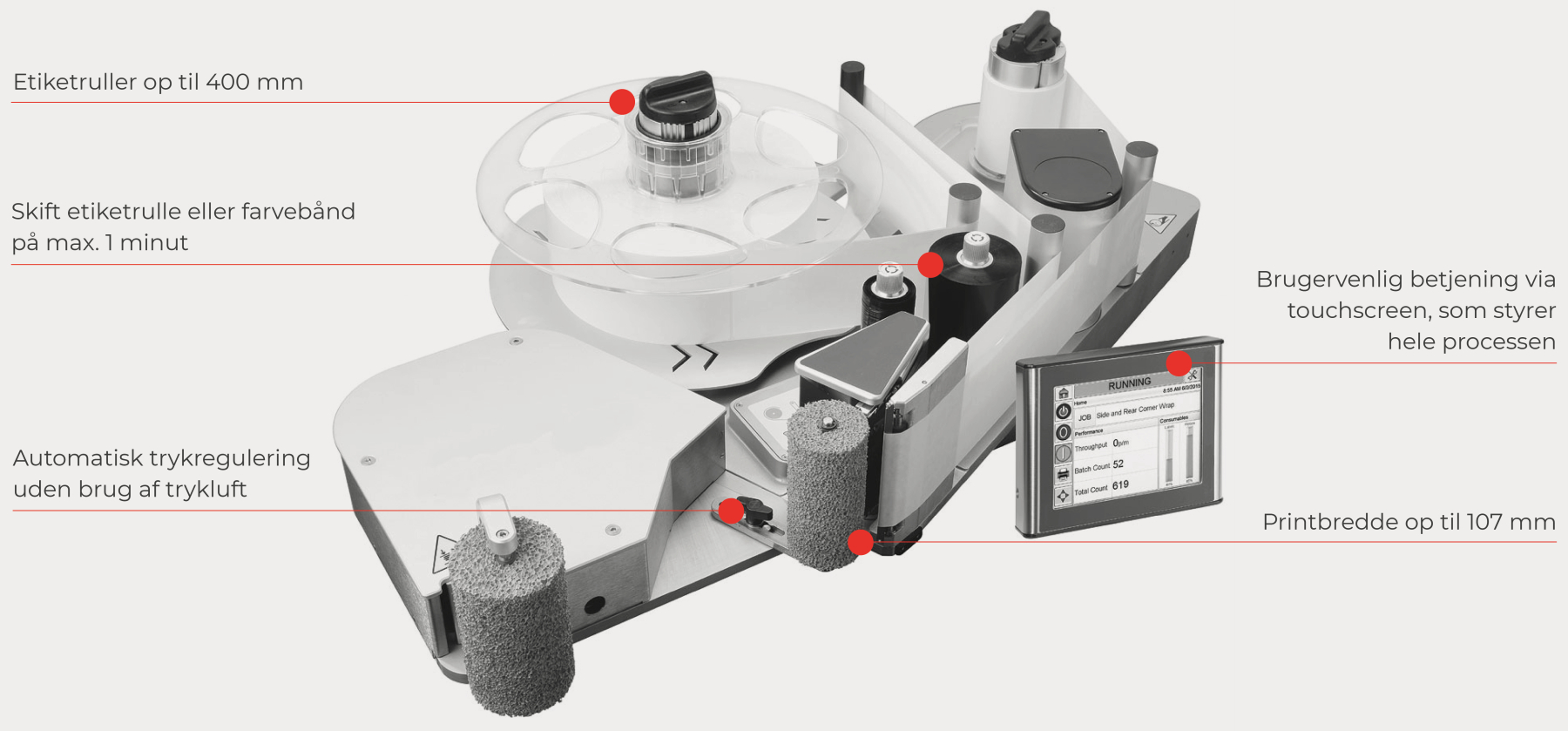 Du får en løsning, som er op til 3 gange hurtigere end andre applikatorer. Den placerer etiketten meget præcist, og har en revolutionerende printhovedteknologi som drives uden trykluft.