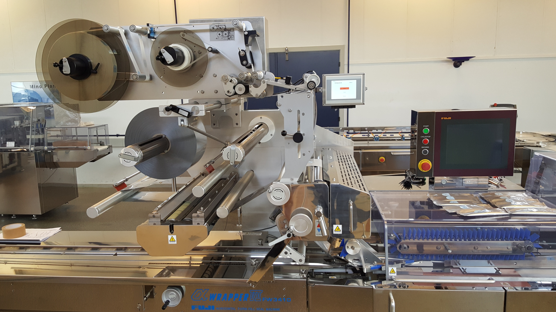 På horisontale flowpakkere hvor pakkefilmen leveres oppefra, monteres etiketterings- og printudstyret ovenover.