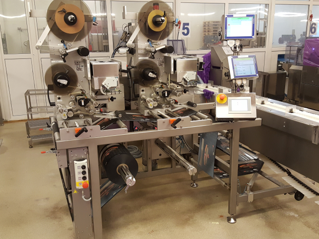 Den enestående etiketteringsenhed monteres ofte vinkelret på flowpakkeren, og kan suppleres med en printløsning.